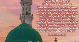 Hazrat Anas (radiyallahu anhu) narrates that on one occasion, the Sahaabah (radhiyallahu anhum) were seated in the blessed company of Rasulullah (sallallahu alaihi wasallam) when he said, “In a few moments, a man from the people of Jannah will appear before you.” Just then, Hazrat Sa’d (radhiyallahu anhu) appeared, carrying his sandals in his left hand, with his beard dripping with the water of wudhu.
