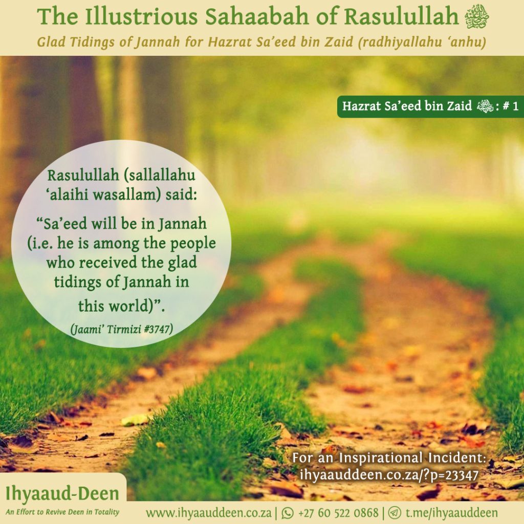 Hazrat Sa’eed bin Zaid (radhiyallahu ‘anhu) participated in all the other battles with Rasulullah (sallallahu ‘alaihi wasallam).