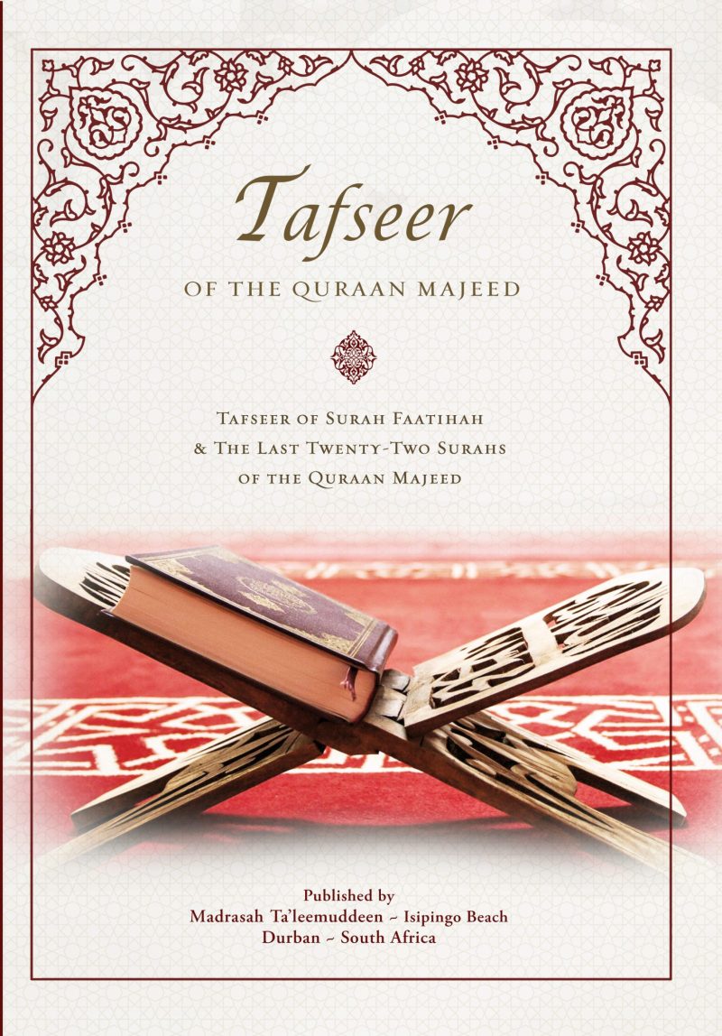 However, since the average person does not understand the Arabic language, and the message of the Quraan Majeed cannot be fully understood without referring to the Ahaadith of Rasulullah (sallallahu alaihi wasallam), the statements of the Sahaabah (radhiyallahu anhum) and the Imaams of Tafseer (the Mufassireen commentators of the Quraan Majeed), a need was felt to prepare a kitaab of the tafseer of selected surahs in the English language, to make it possible for the masses to understand the message of the Quraan Majeed.