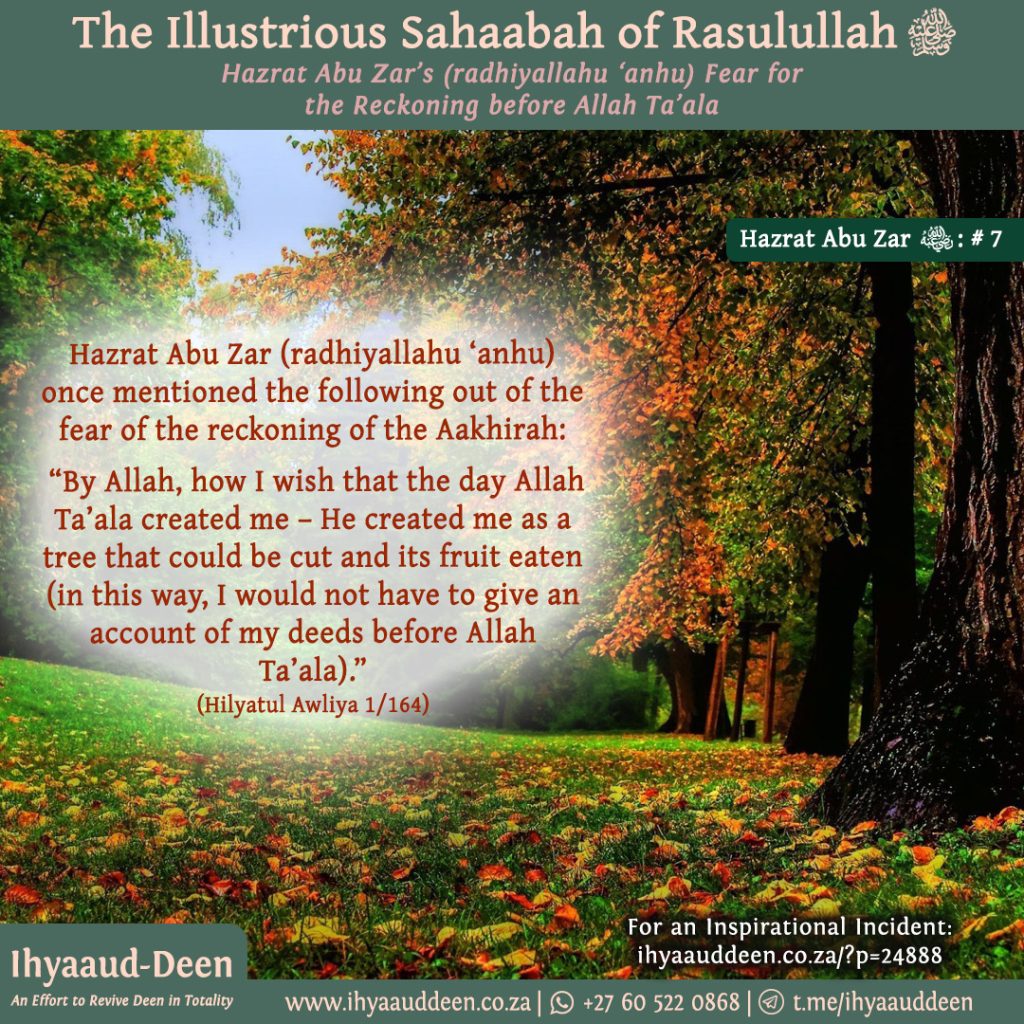 “I was once seated in a gathering in which Abu Zarr was also present. The thought was in my mind that perhaps Abu Zarr is upset with Hazrat Uthmaan (radhiyallahu ‘anhu) due to Hazrat Uthmaan (radhiyallahu ‘anhu) asking him to leave Madinah Munawwarah and settle in Rabadha.